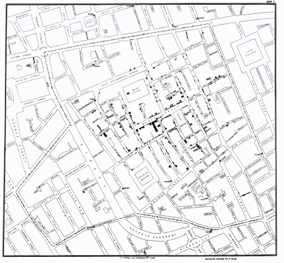 约翰·斯诺(John Snow)绘制的原始地图,显示了1854年伦敦疫情中的霍乱病例集群,由查尔斯·切芬斯(Charles Cheffins)进行了平版绘制。来源-维基百科